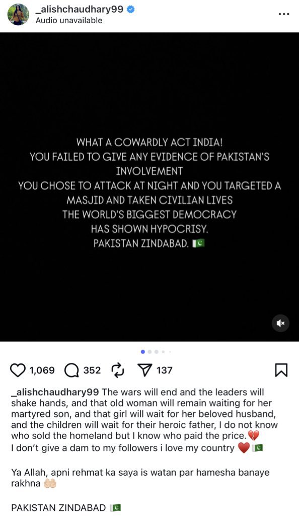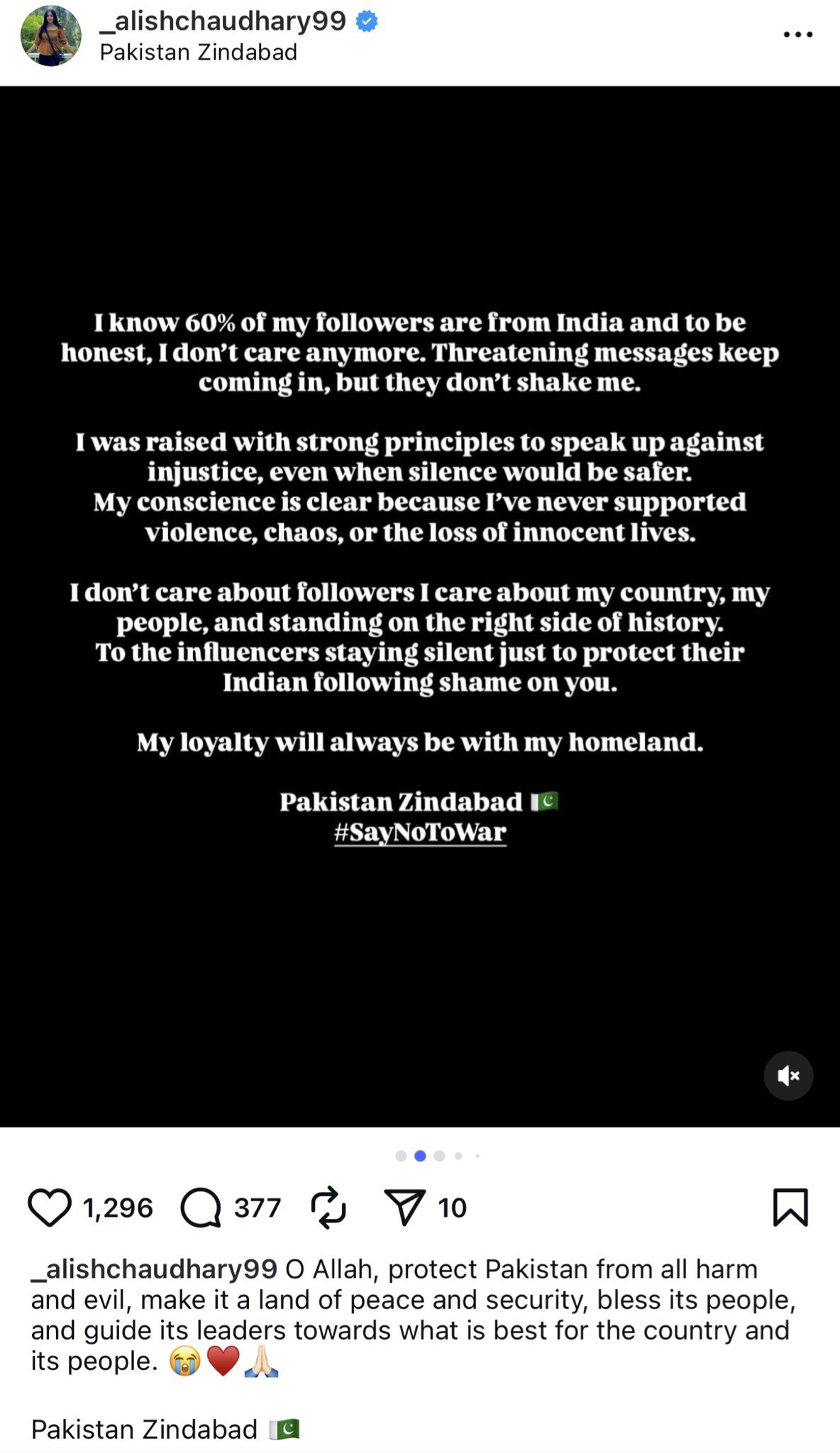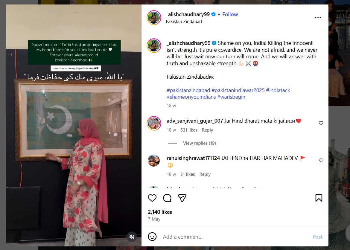 The controversy centres on Khalid’s social media activity, particularly her posts from May 2025 condemning India’s ‘Operation Sindoor’. In now-deleted but widely circulated posts, she labelled the operation a “cowardly act,” accused India of hypocrisy, and ended with “PAKISTAN ZINDABAD.” In another post, she explicitly stated, “I know 60% of my followers are from India and to be honest, I don’t care anymore,” and concluded with a prayer for Pakistan’s protection from harm and evil. A further post from May 7 threatened, “Just wait now our turn will come. And we will answer with truth and unshakable strength.”