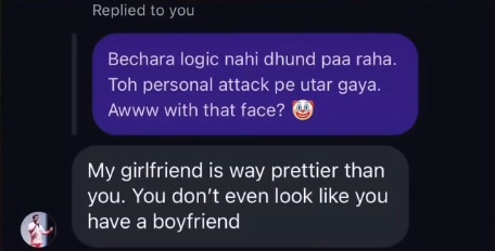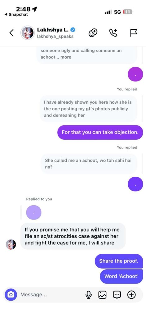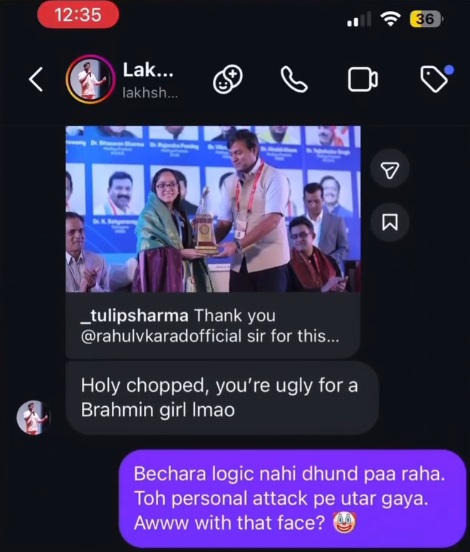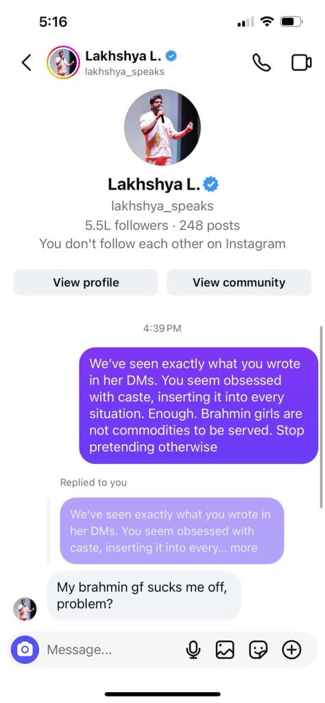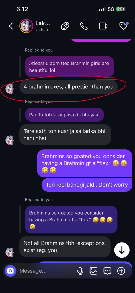 Screenshots show Lakey immediately turning personal — and casteist. He began boasting about his “Brahmin girlfriends,” using them as trophies to demean a woman who dared question him, and how they were “prettier than Tulip.”