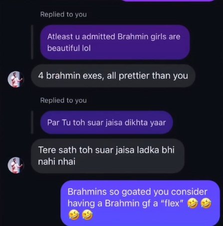 When called out, he doubled down: “4 Brahmin exes, all prettier than you.”