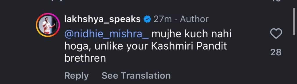 In public exchanges captured in screenshots, when a user commented on his conduct, Lakey reportedly replied: “Kashmir Brahmano ka yehi halat tha” (This was the fate of Kashmiri Brahmins too).