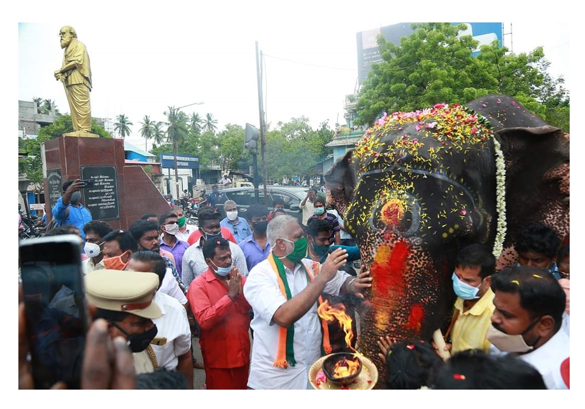 Puducherry Chief Minister Narayanasamy also welcomed the temple elephant Lakshmi and received blessings from her.