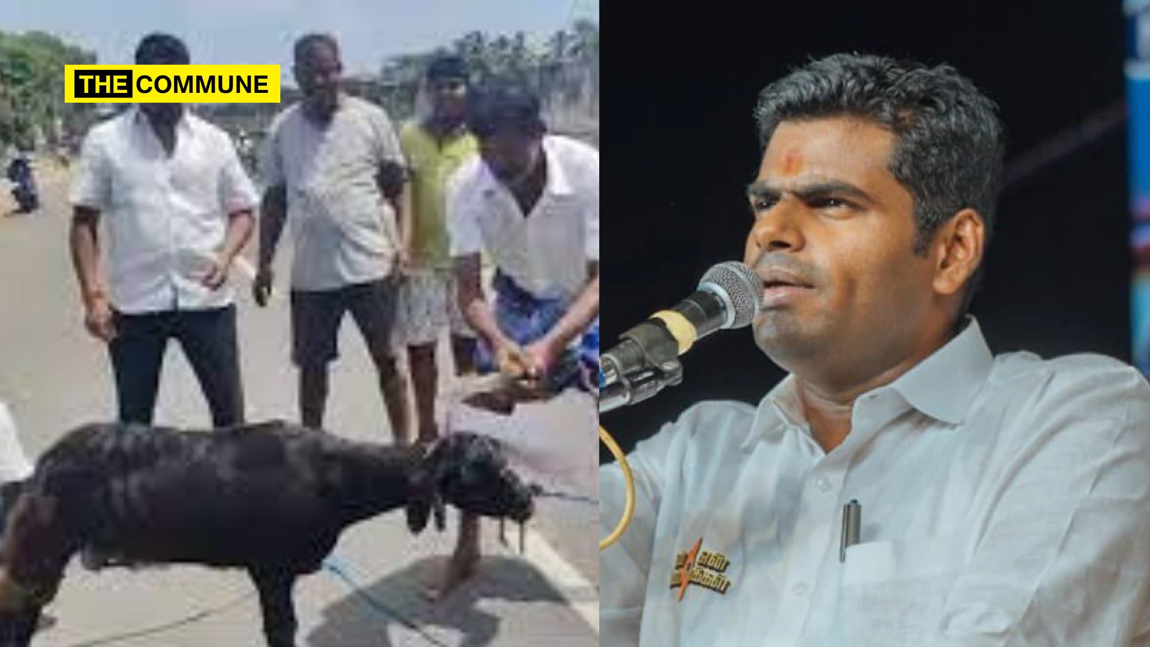 This is how Annamalai’s political rivals ‘celebrated’ DMK win in Tamil Nadu – by slaughtering a goat in full public view, with a picture of Annamalai on it.