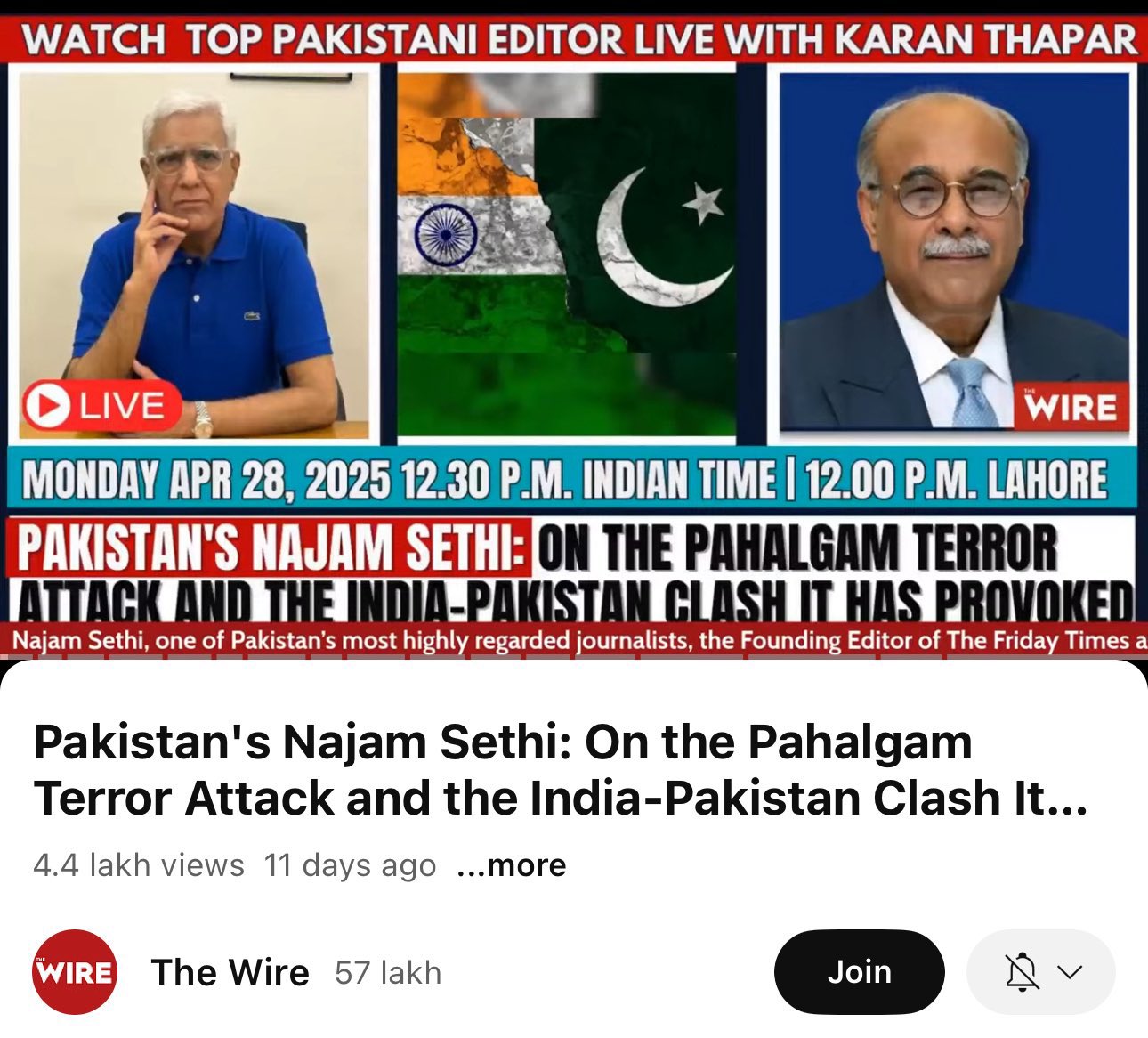 Despite clear advisories from the Ministry of Information & Broadcasting, veteran journalist Karan Thapar hosted a live discussion featuring Pakistani commentator Najam Sethi and others during India’s military response to Pakistan-sponsored terrorism in Operation Sindoor. The interview provided a platform for anti-India narratives at a highly sensitive time—leading to widespread criticism and accusations of undermining national interests.