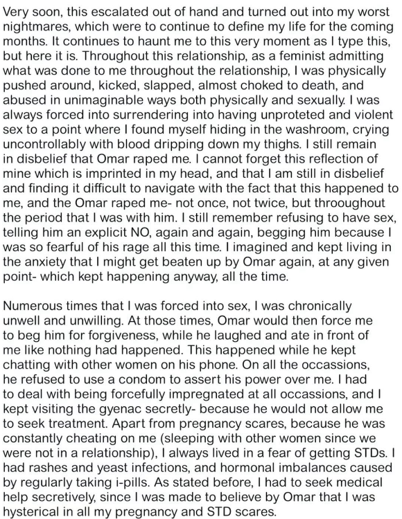 She further added, “Very soon, this escalated out of hand and turned out into my worst nightmares, which were to continue to define my life for the coming months. It continues to haunt me to this very moment as I type this, but here it is. Throughout this relationship, as a feminist admitting what was done to me throughout the relationship, I was physically pushed around, kicked, slapped, almost choked to death, and abused in unimaginable ways both physically and sexually. I was always forced into surrendering into having unprotected and violent sex to a point where I found myself hiding in the washroom, crying uncontrollably with blood dripping down my thighs. I still remain in disbelief that Omar raped me. I cannot forget this reflection of mine which is imprinted in my head, and that I am still in disbelief and finding it difficult to navigate with the fact that this happened to me, and the Omar raped me- not once, not twice, but throoughout the period that I was with him. I still remember refusing to have sex, telling him an explicit NO, again and again, begging him because I was so fearful of his rage all this time. I imagined and kept living in the anxiety that I might get beaten up by Omar again, at any given point- which kept happening anyway, all the time.”
