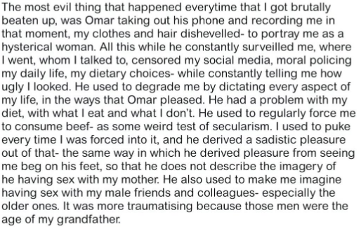 She claimed, “The most evil thing that happened every time that I got brutally beaten up, was Omar taking out his phone and recording me in that moment, my clothes and hair disheveled- to portray me as a hysterical woman. All this while he constantly surveilled me, where I went, whom I talked to, censored my social media, moral policing my daily life, my dietary choices- while constantly telling me how ugly I looked. He used to degrade me by dictating every aspect of my life, in the ways as that Omar pleased. He had a problem with my diet, with what I eat and what I don’t. He used to regularly force me to consume beef- as some weird test of secularism. I used to puke every time I was forced into it, and he derived a sadistic pleasure out of that- the same way in which he derived pleasure from seeing me beg on his feet, so that he does not describe the imagery of he having sex with my mother. He also used to make me imagine having sex with my male friends and colleagues- especially the older ones. It was more traumatizing because those men were the age of my grandfather.”