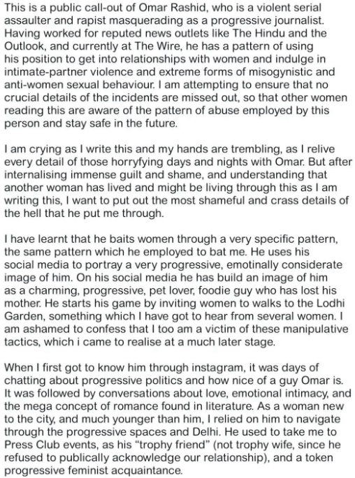 She alleged, “This is a public call-out of Omar Rashid, who is a violent serial assaulter and rapist masquerading as a progressive journalist. Having worked for reputed news outlets like The Hindu and the Outlook, and currently at The Wire, he has a pattern of using his position to get into relationships with women and indulge in intimate-partner violence and extreme forms of misogynistic and anti-women sexual behavior. I am attempting to ensure that no crucial details of the incidents are missed out, so that other women reading this are aware of the pattern of abuse employed by this person and stay safe in the future. I am crying as I write this and my hands are trembling, as I relive every detail of those horrifying days and nights with Omar. But after internalizing immense guilt and shame, and understanding that another woman has lived and might be living through this as I am writing this, I want to put out the most shameful and crass details of the hell that he put me through. I have learnt that he baits women through a very specific pattern, the same pattern which he employed to bat me. He uses his social media to portray a very progressive, emotionally considerate image of him. On his social media he has build an image of him as a charming, progressive, pet lover, foodie guy who has lost his mother. He starts his game by inviting women to walks to the Lodhi Garden, something which I have got to hear from several women. I am ashamed to confess that I too am a victim of these manipulative tactics, which i came to realize at a much later stage. When I first got to know him through Instagram, it was days of chatting about progressive politics and how nice of a guy Omar is. It was followed by conversations about love, emotional intimacy, and the mega concept of romance found in literature. As a woman new to the city, and much younger than him, I relied on him to navigate through the progressive spaces and Delhi. He used to take me to Press Club events, as his “trophy friend” (not trophy wife, since he refused to publically acknowledge our relationship), and a token progressive feminist acquaintance.”