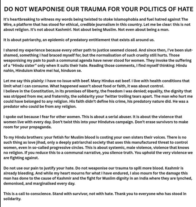 In a recent heartfelt message, the survivor expressed deep anguish over how her words are being distorted to inflame Islamophobia and direct hostility toward The Wire, a media outlet she still regards as committed to ethical journalism in India. She made it unequivocally clear: her ordeal is not about religion. It’s not about being Kashmiri. It’s not about being Muslim. It’s not even about gender alone. It’s about patriarchy — a deeply ingrained culture of male entitlement that permeates every layer of society.
