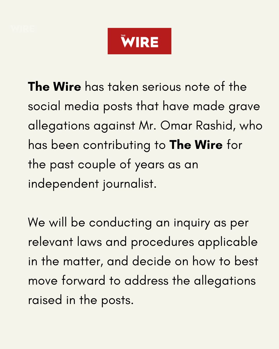 The Wire stated, “The Wire has taken serious note of the social media posts that have made grave allegations against Mr. Omar Rashid, who has been contributing to The Wire for the past couple of years as an independent journalist. We will be conducting an inquiry as per relevant laws and procedures applicable in the matter, and decide on how to best move forward to address the allegations raised in the posts.”