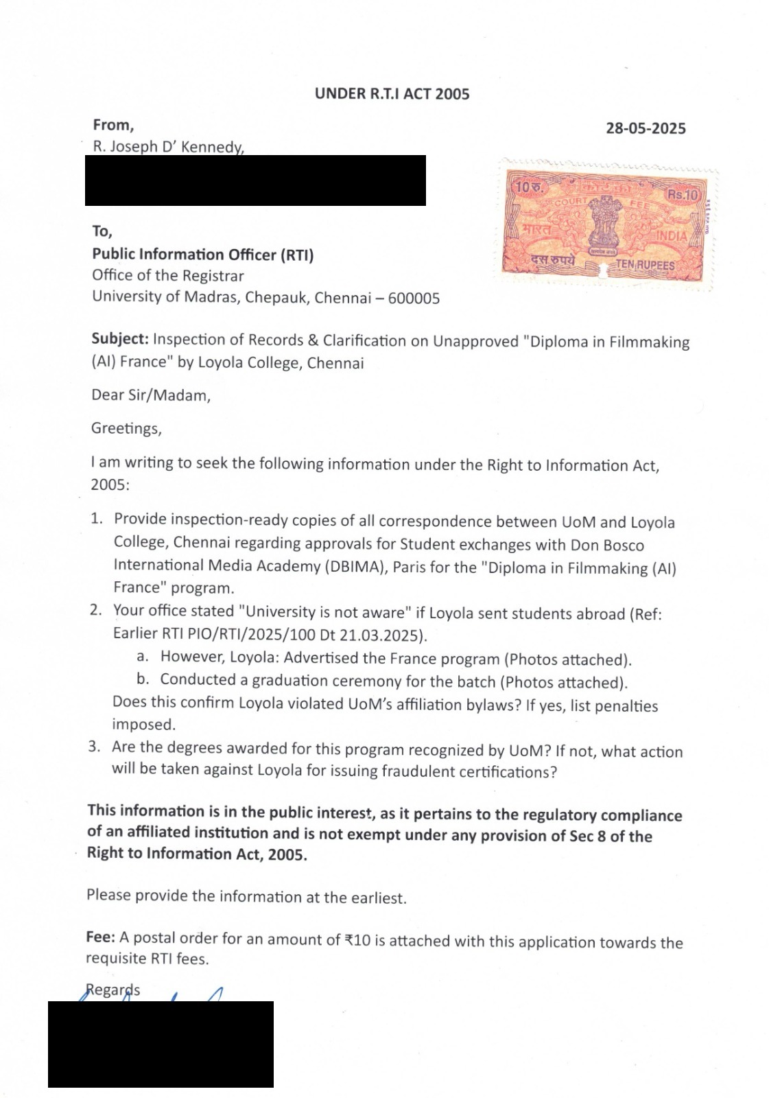 Kennedy’s RTI sought clarification on the academic legitimacy of the filmmaking diploma, the nature of correspondence between Loyola and the university, and possible violations of affiliation norms. Yet, the university effectively washed its hands of the matter.