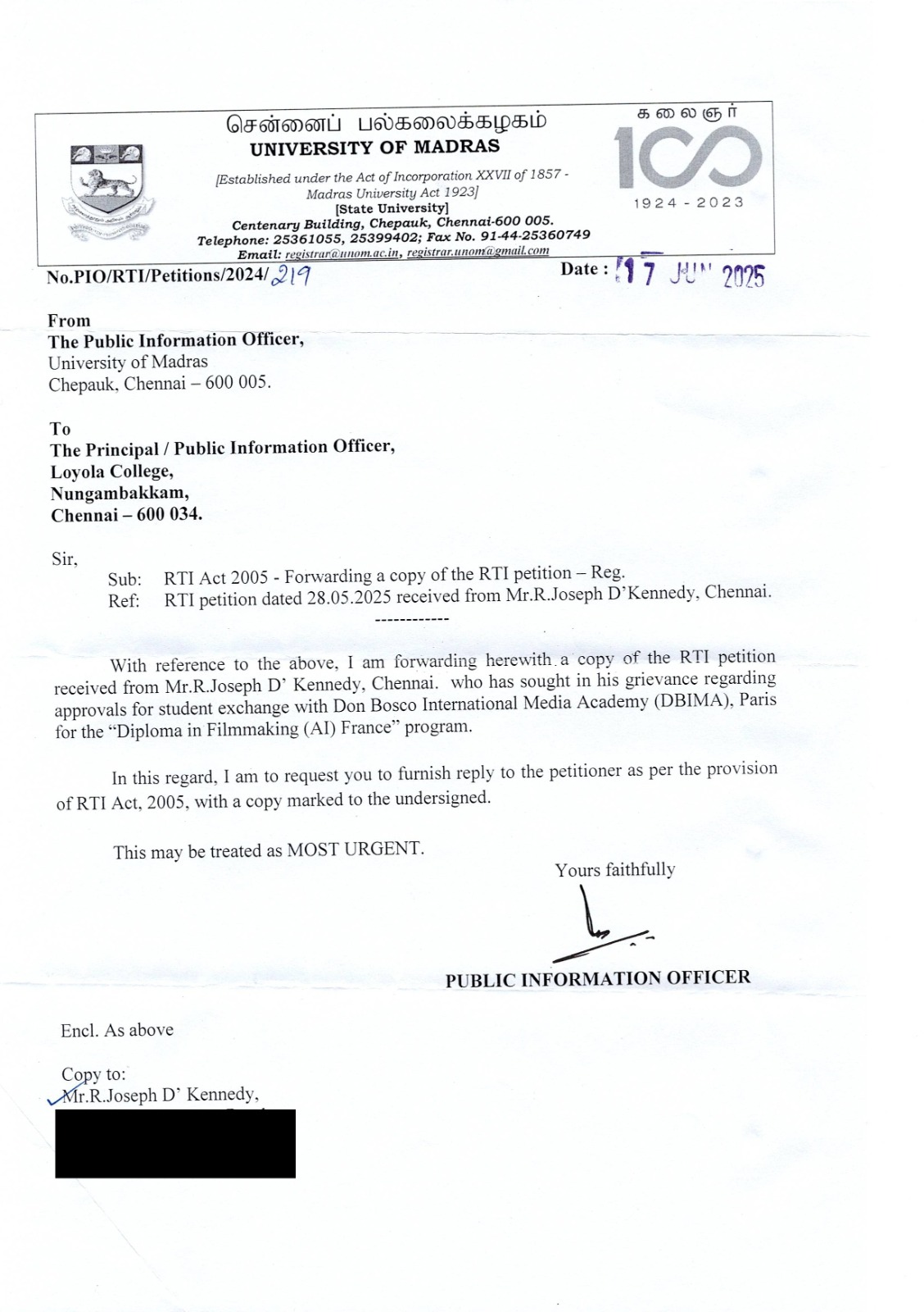 Despite the program being heavily promoted, including by DBIMA’s CEO Fr. John Paul Swaminathan, an RTI response from the University of Madras Loyola’s affiliating university confirms that the filmmaking diploma has not received formal approval, rendering it illegitimate under Indian regulations.