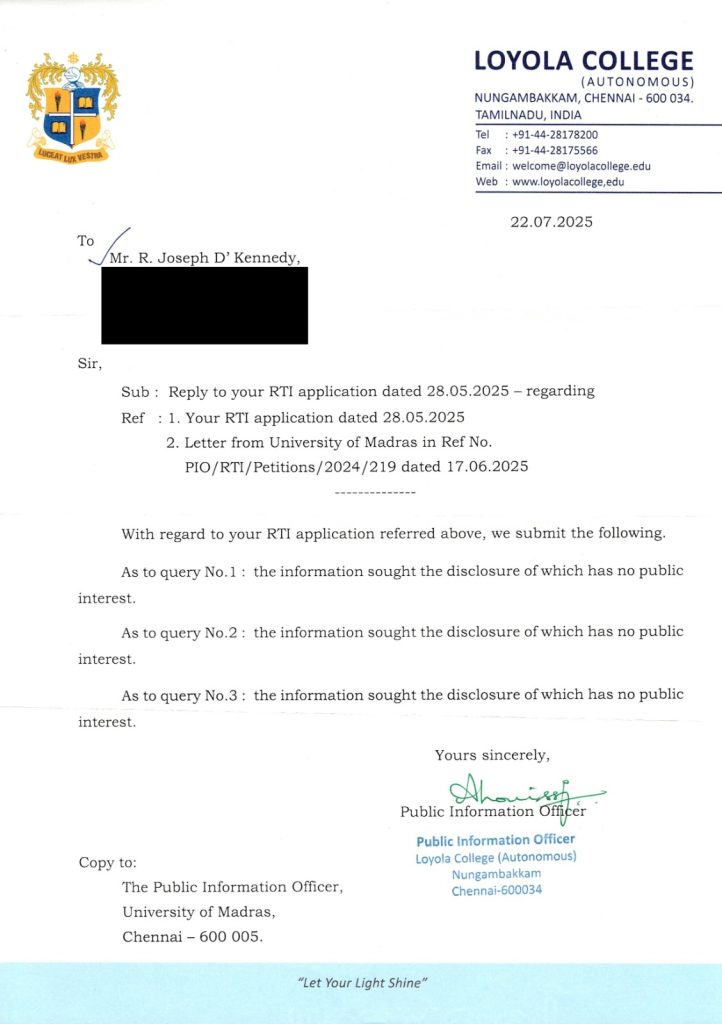 In parallel, Loyola’s evasive handling of RTI inquiries has amplified public criticism. The college failed to respond within the 30-day timeframe mandated by the RTI Act and, when it eventually replied, declined to share meaningful information dismissing the request as not being in the “public interest.”