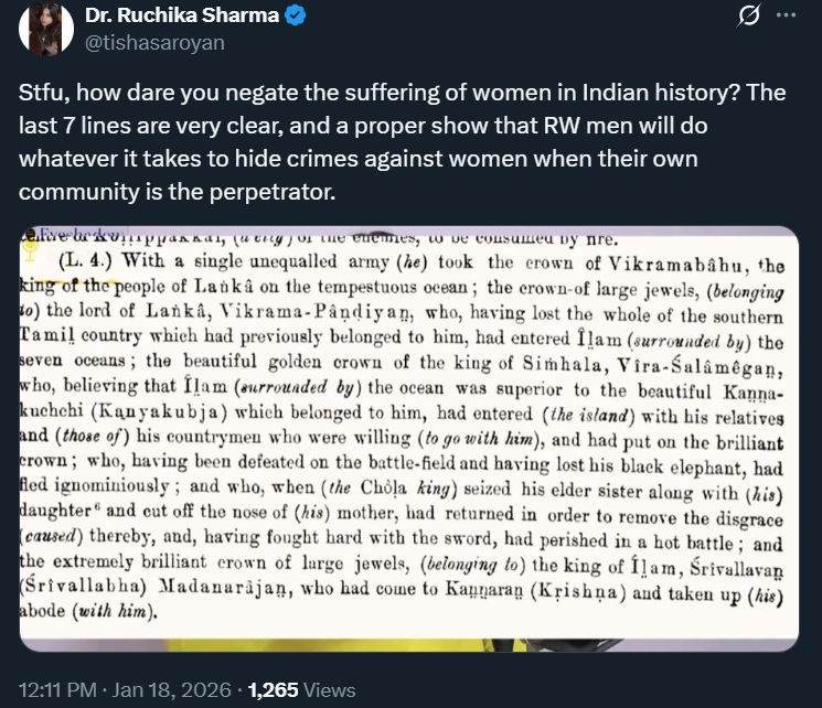 Instead of admitting that she may have been wrong in interpreting the Tamil scripture, she resorted to abuse. History cannot be written through abuse, selective outrage, or ideological immunity. Feminism cannot function as a switch turned on only when it targets Hindus, and off when it inconveniences other identities. When trauma is invoked not to seek truth but to silence it, scholarship ends and propaganda begins.
