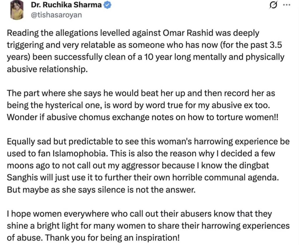 So, when she brought up the topic of people trying to hide crimes of the perpetrator, netizens reminded her of her own story – when she tried to hide the abuse she suffered at the hands of a Muslim boyfriend which she revealed in May 2025 when the allegations of sexual abuse and domestic violence made by a woman against Omar Rashid, a contributor associated with The Wire came out. Sharma shared the survivor’s account and wrote that it was “deeply triggering” due to her own experience of a long abusive relationship. She wrote, “Reading the allegations levelled against Omar Rashid was deeply triggering and very relatable as someone who has now (for the past 3.5 years) been successfully clean of a 10 year-long mentally and physically abusive relationship. The part where she says he would beat her up and then record her as being the hysterical one, is word by word true for my abusive ex too. Wonder if abusive chomus exchange notes on how to torture women!! Equally sad but predictable to see this woman’s harrowing experience be used to fan Islamophobia. This is also the reason why I decided a few moons ago to not call out my aggressor because I know the dingbat Sanghis will just use it to further their own horrible communal agenda. But maybe as she says silence is not the answer.”