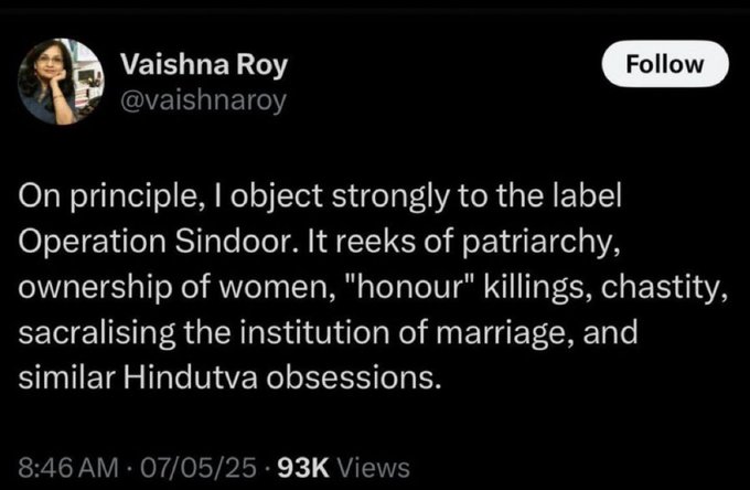 Vaishna Roy’s response was posted within hours: “On principle, I object strongly to the label Operation Sindoor. It reeks of patriarchy, ownership of women, honour killings, chastity, sacralising the institution of marriage, and similar Hindutva obsessions.”