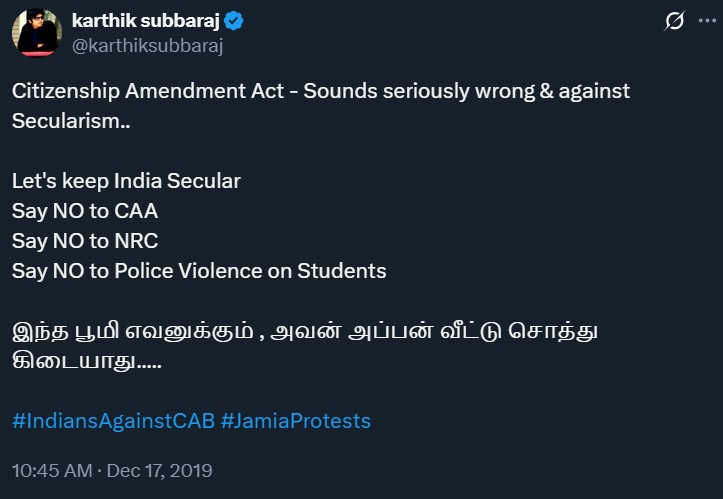How can we forget these Kollywood celebrities and their vocal voices against CAA. Here’s Karthik Subbaraj doing the needful. He found it “seriously wrong and against secularism” and wanted to keep India “secular”. How kind! In the same vein, he even voices against NRC.