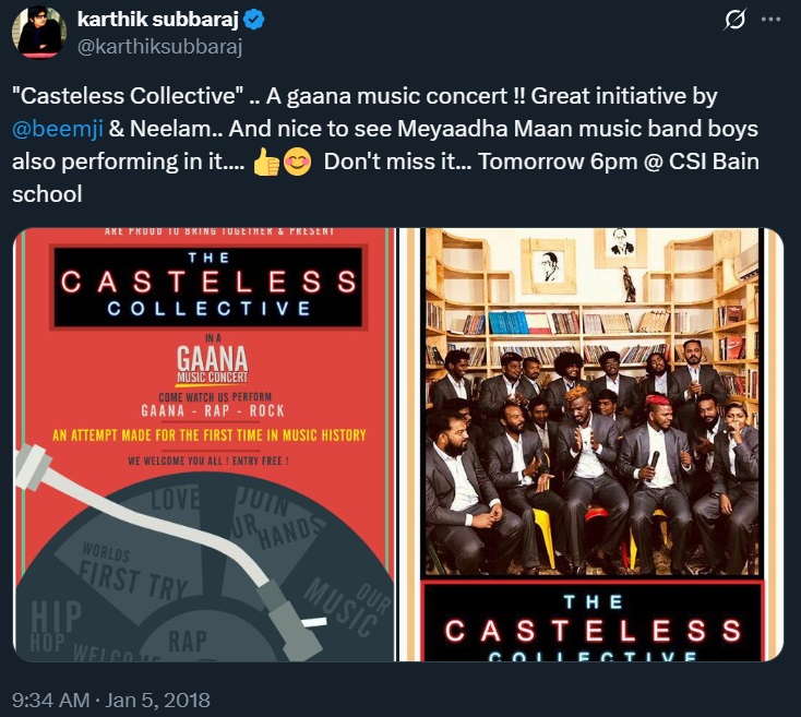 Last but not the least, here’s Karthik Subbaraj showing his support for the pusillanimous Ra Ranjith who will not talk about atrocities against Dalits when inconvenient. We all know what this “gaana concert” was initiated to achieve.