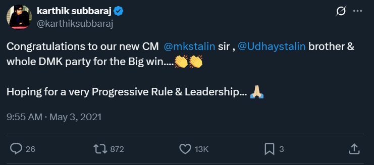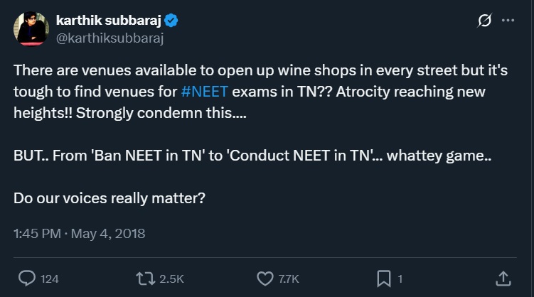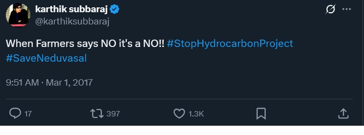 Karthik Subbaraj, like many of his Dravidianwood peers, has shown loyalty to the present ruling state government by voicing out against central government projects like the hydrocarbon project in Neduvasal.