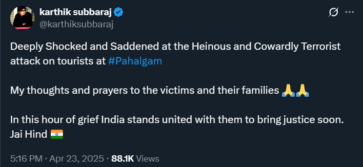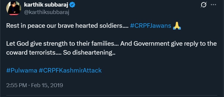 Here’s Subbaraj doing lip service to terror attacks that happened in Kashmir without naming the perpetrators. Look at the language he uses – like every other Dravidianist, given a chance, it feels like he will also peddle the same lies that people like Senthilvel and Madan Gowri peddle and whitewash the real Islamic terrorists from Pakistan as some “foreigners”. Here’s what he said for Pulwama terror attack: