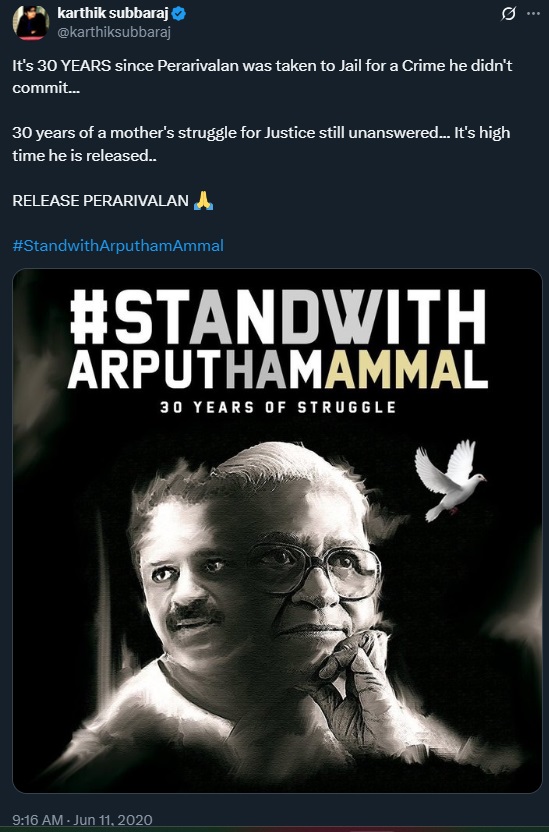 A.G. Perarivalan is a terrorist convicted for assassinating former Indian Prime Minister Rajiv Gandhi and we have the likes of Subbaraj vouching for his innocence.