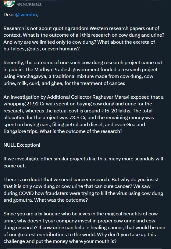 Replying to Vembu’s post, the Congress Kerala handle wrote, “Dear @svembu, Research is not about quoting random Western research papers out of context. What is the outcome of all this research on cow dung and urine? And why are we limited only to cow dung? What about the excreta of buffaloes, goats, or even humans? Recently, the outcome of one such cow dung research project came out in public. The Madhya Pradesh government funded a research project using Panchagavya, a traditional mixture made from cow dung, cow urine, milk, curd, and ghee, for the treatment of cancer. An investigation by Additional Collector Raghuvar Maravi exposed that a whopping ₹1.92 Cr was spent on buying cow dung and urine for the research, whereas the actual cost is around ₹15–20 lakhs. The total allocation for the project was ₹3.5 Cr, and the remaining money was spent on buying cars, filling petrol and diesel, and even Goa and Bangalore trips. What is the outcome of the research? NULL Exception! If we investigate other similar projects like this, many more scandals will come out. There is no doubt that we need cancer research. But why do you insist that it is only cow dung or cow urine that can cure cancer? We saw during COVID how fraudsters were trying to kill the virus using cow dung and gomutra. What was the outcome? Since you are a billionaire who believes in the magical benefits of cow urine, why doesn’t your company invest in proper cow urine and cow dung research? If cow urine can help in healing cancer, that would be one of our greatest contributions to the world. Why don’t you take up this challenge and put the money where your mouth is?”