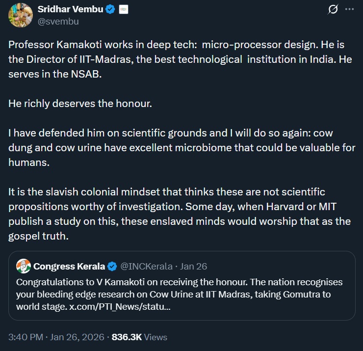Calling out the Congress for its remarks and appreciating Prof Kamakoti, Zoho founder Sridhar Vembu wrote, “Professor Kamakoti works in deep tech: micro-processor design. He is the Director of IIT-Madras, the best technological institution in India. He serves in the NSAB. He richly deserves the honour. I have defended him on scientific grounds and I will do so again: cow dung and cow urine have excellent microbiome that could be valuable for humans. It is the slavish colonial mindset that thinks these are not scientific propositions worthy of investigation. Some day, when Harvard or MIT publish a study on this, these enslaved minds would worship that as the gospel truth.”