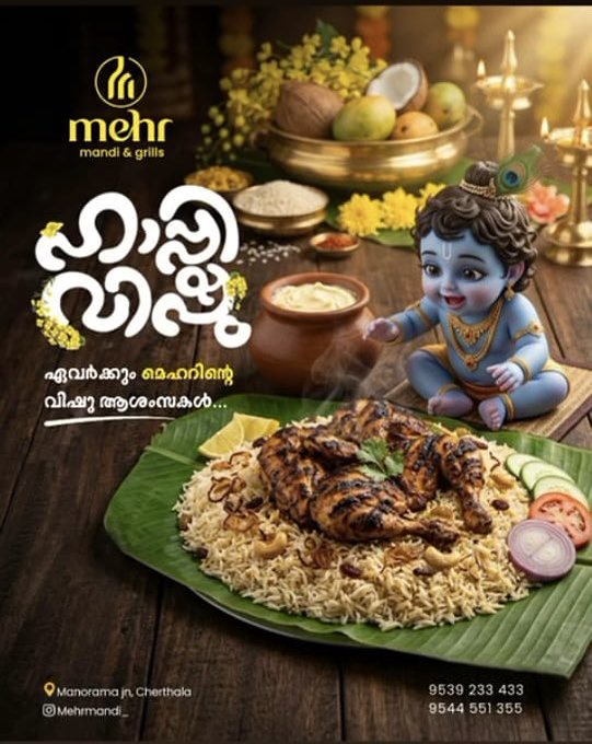 The flashpoint of the controversy was the advertisement released by Mehr Mandi & Grills, owned by Mohammed Shameer along with other partners. The poster, which showed Krishna alongside a non-vegetarian dish as part of a Vishu greeting, quickly went viral and triggered protests. Hindu organisations, including the Vishwa Hindu Parishad, announced demonstrations outside the restaurant.