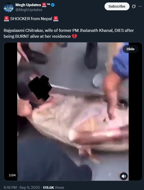 Tragedy struck on 9 September 2025 when Rajyalaxmi Chitrakar, wife of former Prime Minister Jhalanath Khanal, died after being burnt alive at her residence. Reports said protesters set her home on fire, and she was unable to escape.