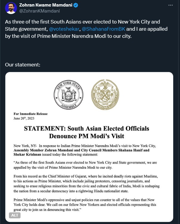 His hatred for PM Modi knows no bounds. In a video of a discussion/debate that went viral earlier in June 2025, Mamdani repeatedly likened Modi to Israeli PM Benjamin Netanyahu, going so far as to call him a “war criminal” during a recent public forum. He cited the 2002 Gujarat riots as justification, failing to mention that India’s Supreme Court had cleared Modi of any involvement after extensive investigations. In the video, he responds to the question “Modi is holding a rally in Madison Square Garden. He wants to hold a joint press conference with you afterwards reaffirming the strong bond between India and New York. Do you agree to the event?” with this response – “No, and I just want to say something here which is that. My father, his family comes from Gujarat in India and his family is Muslim, I am Muslim and Narendra Modi helped to orchestrate what was a mass slaughter of Muslims in Gujarat to the extent that we don’t even believe there are Gujarati Muslims anymore, and when I tell someone that I am, it’s a shock to them that that is even the case. And this is someone who we should view in the same manner that we do Benjamin Netanyahu; this is a war criminal.”