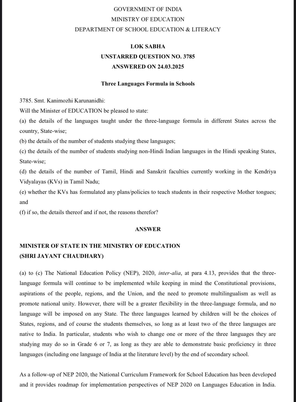 During a Lok Sabha session on 24 March 2025, DMK Deputy General Secretary and Thoothukkudi MP Kanimozhi raised questions regarding the implementation of the three-language formula in schools across India. She sought details on: