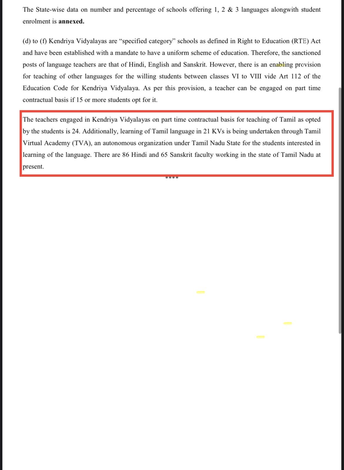 Excerpt from Parliamentary answer reads, “Kendriya Vidyalayas are “specified category” schools as defined in Right to Education (RTE) Act and have been established with a mandate to have a uniform scheme of education. Therefore, the sanctioned posts of language teachers are that of Hindi, English and Sanskrit. However, there is an enabling provision for teaching of other languages for the willing students between classes VI to VIII vide Art 112 of the Education Code for Kendriya Vidyalaya. As per this provision, a teacher can be engaged on part time contractual basis if 15 or more students opt for it. The teachers engaged in Kendriya Vidyalayas on part time contractual basis for teaching of Tamil as opted by the students is 24. Additionally, learning of Tamil language in 21 KVs is being undertaken through Tamil Virtual Academy (TVA), an autonomous organization under Tamil Nadu State for the students interested in learning of the language. There are 86 Hindi and 65 Sanskrit faculty working in the state of Tamil Nadu at present.”