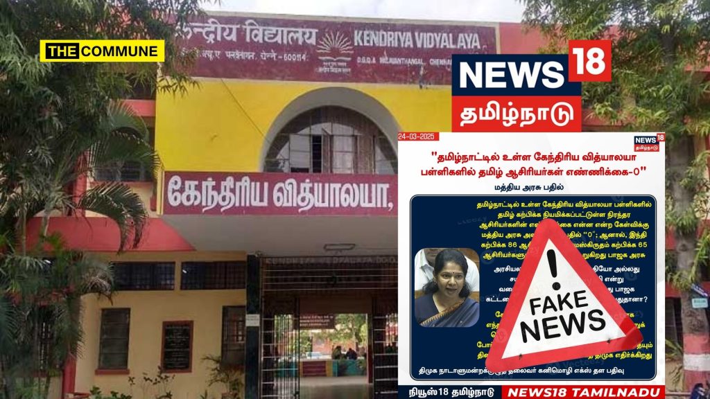 Despite official data confirming that 24 Tamil teachers are engaged on a part-time contractual basis in Kendriya Vidyalayas (KVs) across Tamil Nadu, and that Tamil is taught in 21 KVs through the Tamil Virtual Academy (TVA), News 18 Tamil Nadu conveniently omitted these details. Instead, the channel, which has been accused of favoring the ruling DMK government, falsely reported that “0” Tamil teachers were employed in Kendriya Vidyalayas.