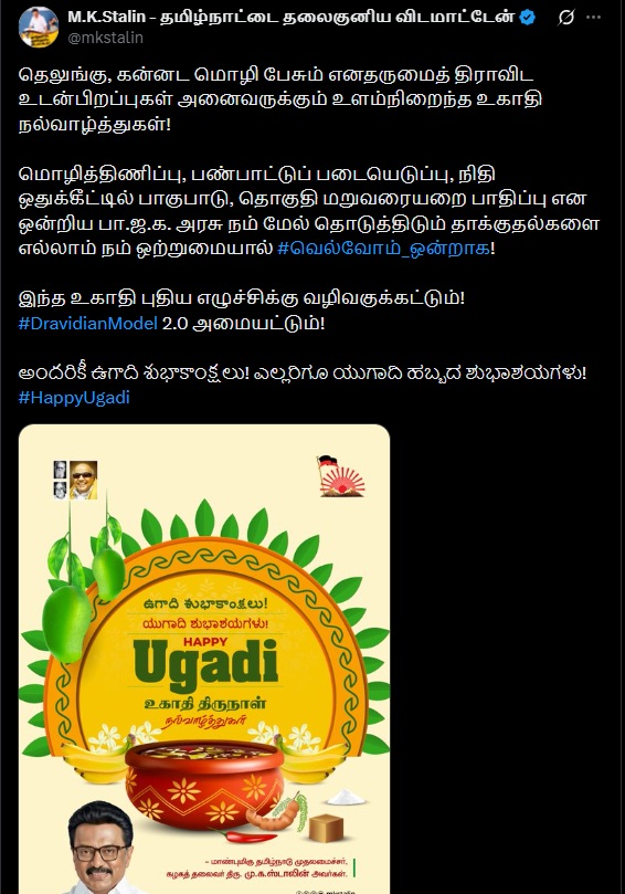 On 19 March 2026, Stalin posted in Telugu on X: “Happy Ugadi to all our Dravidian brothers and sisters who speak Telugu and Kannada! Let us #overcome_together with our unity all the attacks that the BJP government is launching against us, such as language oppression, cultural invasion, discrimination in financial allocation, and the impact of constituency redelineation! May this Ugadi pave the way for a new upsurge! May #DravidianModel 2.0 be established!”
