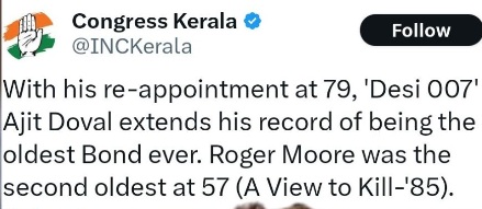 In its now-deleted post, the Kerala Congress in its official X handle wrote, “With his re-appointment at 79, ‘Desi 007’ Ajit Doval extends his record of being the oldest Bond ever. Roger Moore was the second oldest at 57 (A View to Kill-‘85)”