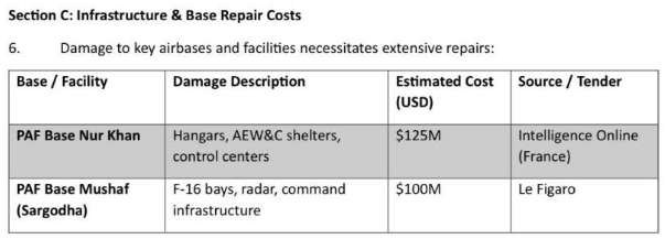 The damage to military infrastructure and airbases further compounded Pakistan’s losses. At PAF Base Nur Khan, critical AEW&C shelters and control centers were struck, requiring an estimated $125 million in repairs. At PAF Base Mushaf in Sargodha, damage to radar systems and F-16 command bays necessitates $100 million in reconstruction costs. Altogether, infrastructure damage is projected at $225 million USD.