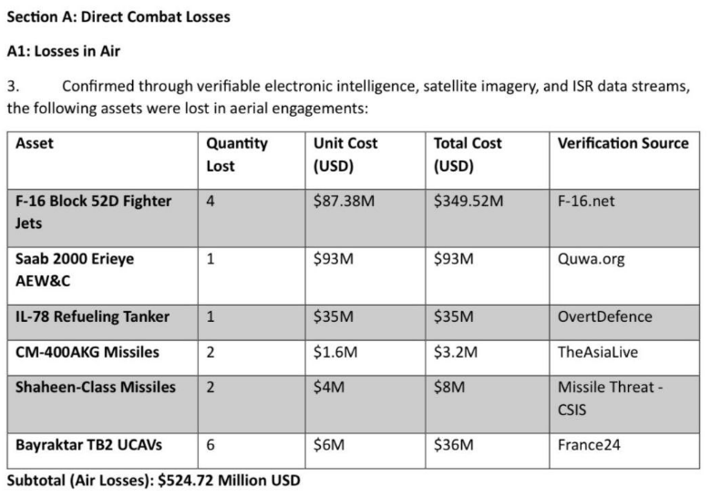 The aerial combat, which covers direct asset losses, resulted in the confirmed downing of multiple key assets. These include four F-16 Block 52D fighter jets valued at $87.38 million each (totaling $349.52 million), one Saab 2000 Erieye AEW&C at $93 million, and an IL-78 aerial refueling aircraft worth $35 million. Additionally, Pakistan lost two CM-400AKG missiles and two Shaheen-class missiles valued at $3.2 million and $8 million respectively. Six Bayraktar TB2 unmanned combat aerial vehicles (UCAVs) were also eliminated, amounting to $36 million. In total, these aerial losses alone amounted to approximately $524.72 million.