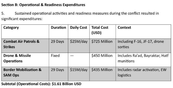 The sustained deployment of combat air patrols, strike sorties, and drone missions over 29 days led to an estimated cost of $725 million. Concurrent drone and missile operations involving systems such as Ra’ad, Bayraktar, and Hatf munitions added another $450 million. In addition, round-the-clock border mobilization, electronic warfare logistics, and radar activations cost an estimated $435 million. Combined, these operational activities incurred $1.61 billion USD in additional expenditure.