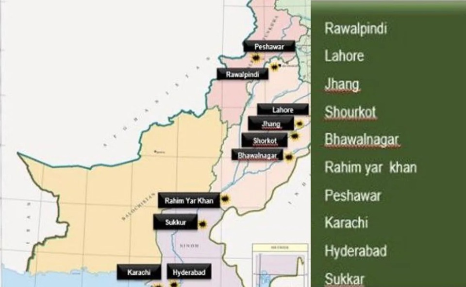 According to the maps included in the dossier, Indian drone and air strikes targeted Peshawar, Jhang, Hyderabad (Sindh), Gujrat (Punjab), Bhawalnagar, Attock, and Chor — locations that were not listed in official briefings by the Indian Air Force (IAF) or the Director General of Military Operations (DGMO).