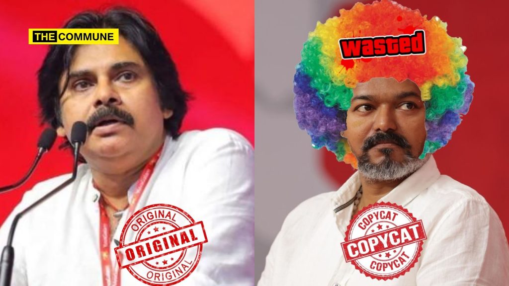 Part-time politician Vijay has often found success by remaking hit Telugu films for the Tamil audience. While he currently copies his political path of the DMK, he surprised many during his first general council meeting by quoting lines from Alfred Lord Tennyson’s poem The Brook—a gesture previously used by Telugu actor-turned-politician and Andhra Pradesh Deputy Chief Minister.