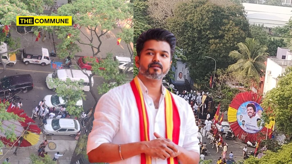 Part-time politician Vijay organized this meeting to mark the party’s one-year anniversary. Massive cutouts of Vijay were erected outside the venue, with the entrance designed to mimic the Tamil Nadu Secretariat. The venue was heavily decorated with banners and posters showcasing Vijay’s political journey, while the atmosphere was filled with the rhythmic beats of dhols and nagadas.