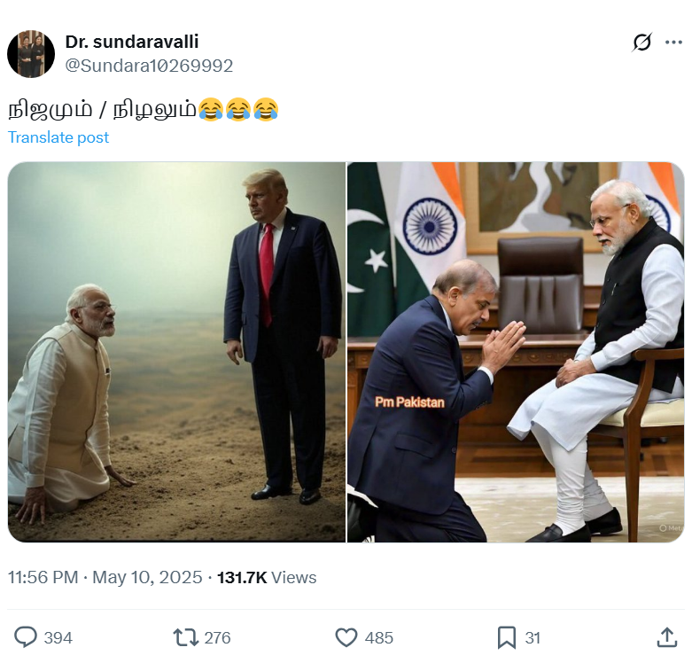 In this context, the Periyarist figure “Sundaravalli” posted an AI-generated image on her social media account, depicting Pakistan’s Prime Minister kneeling before Indian Prime Minister Narendra Modi, and Modi kneeling before U.S. President Trump. This was clearly an anti-India rhetoric on her official X account under the title “The Truth and Shadow,” which has since faced severe criticism.