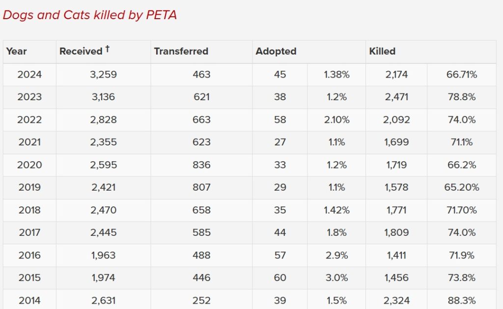 While PETA condemns hunting, medical testing, and even pet ownership, its own shelter operates like an assembly line of death. - Adoption rates are abysmal: only 1.38% of animals were adopted in 2024.