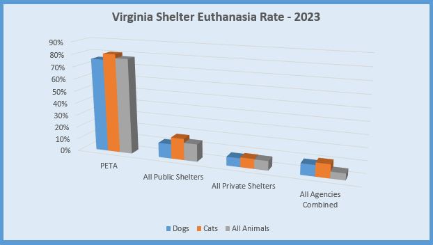 By comparison, most private shelters in Virginia maintain euthanasia rates below 10%, striving for “no-kill” status (90%+ adoption rates). Even Norfolk’s public animal shelter, which operates under similar constraints, euthanized just 14% of dogs in 2023, far lower than PETA’s 76%.