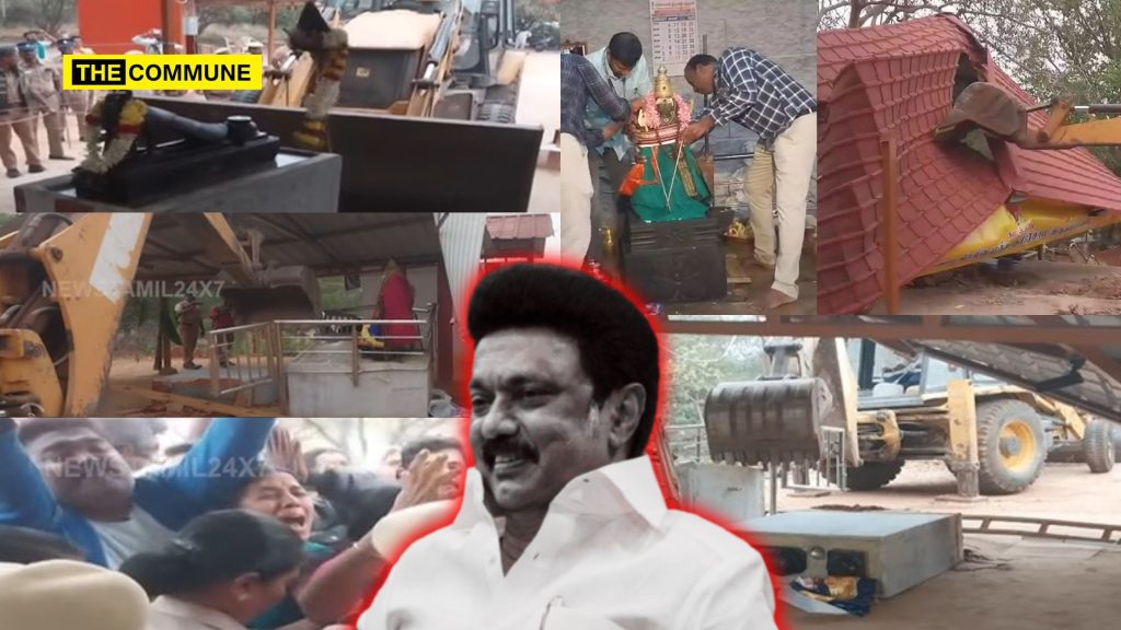 Tension escalated in Rakkiyapatti village under the Ettiveerampalayam panchayat in Avinashi taluk of Tiruppur district after a protest against the demolition of a Murugan temple allegedly built on encroached government land turned violent, leaving a Hindu Munnani leader injured.