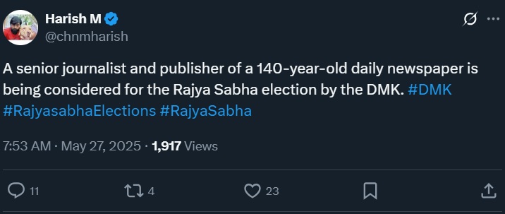 N. Ram, publisher of the 140-year-old The Hindu who hides façade of journalistic objectivity, long seen as a veteran voice in Indian media, now finds himself at the center of political speculation: the DMK is reportedly considering nominating him to the Rajya Sabha. It’s not a surprising development. For years, Ram has been less a neutral journalist and more a vocal mouthpiece for DMK propaganda — echoing the party’s positions, publishing Stalin’s op-eds, and attacking the Tamil Nadu Governor with near-synchronised precision.