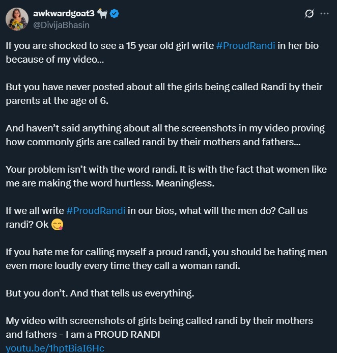 Instead of condemning this alarming trend, Bhasin doubled down, writing on X, “If you are shocked to see a 15-year-old girl write #ProudR*ndi in her bio because of my video, but never spoke when girls were called r*ndi by their parents — your problem isn’t the word. It’s that I’m making it hurtless.”