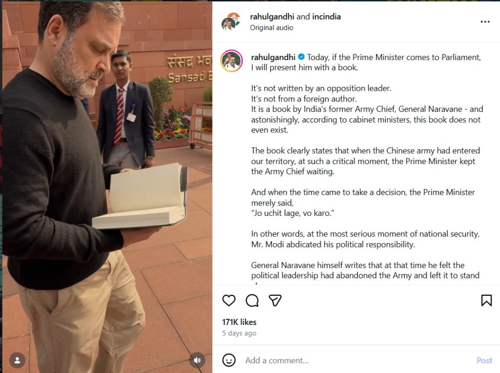 Fast forward to the Budget Session in February 2026, Rahul Gandhi attempted to quote from General Naravane’s yet-to-be-released memoir, alleging it contained material critical of the Modi government’s handling of the 2020 Galwan crisis.