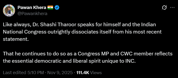 The episode is the latest in a string of flashpoints involving Tharoor, whose independent streak has long chafed against party orthodoxy. Just last week, on November 3, Tharoor penned an op-ed for an international publication decrying dynastic politics as a “grave threat to Indian democracy.”