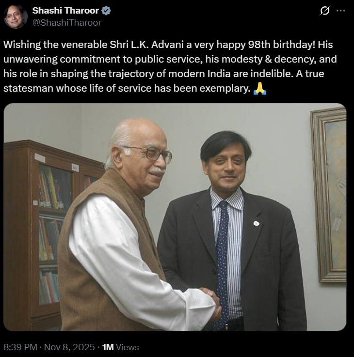 “Wishing the venerable Shri L.K. Advani a very happy 98th birthday! His unwavering commitment to public service, his modesty & decency, and his role in shaping the trajectory of modern India are indelible. A true statesman whose life of service has been exemplary,” Tharoor posted, accompanied by a photo of the BJP icon.