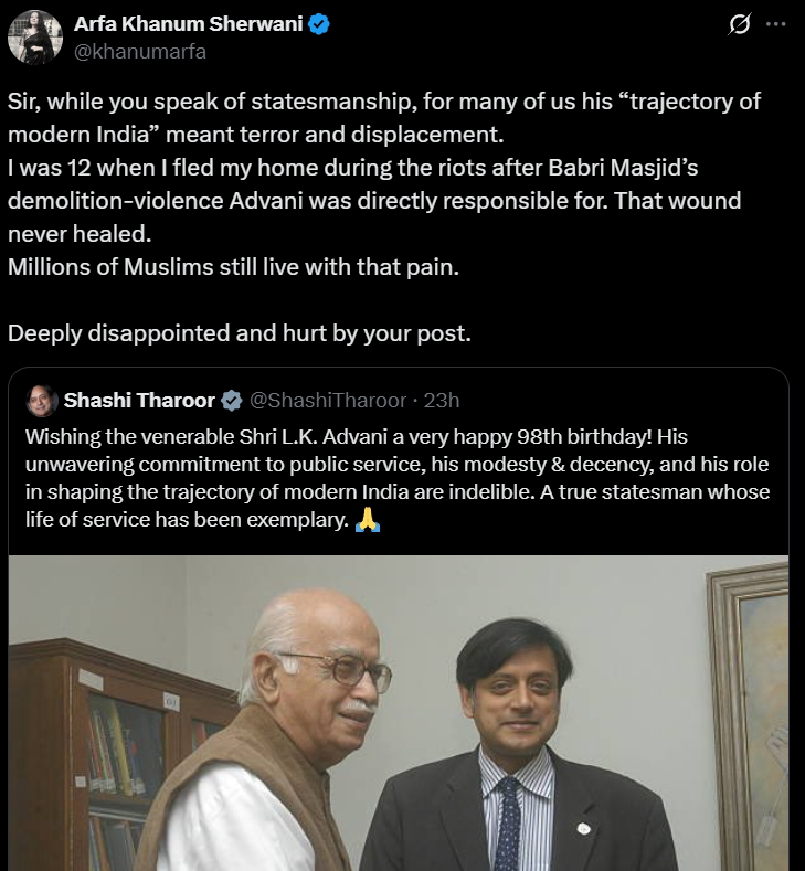 The tribute quickly drew sharp backlash from within Congress ranks and beyond. Islamo-leftist pro-Congress propagandist  Arfa Khanum Sherwani, accused Tharoor of glossing over Advani’s controversial legacy, particularly his role in the 1990 Ram Rath Yatra, which triggered widespread communal riots following the 1992 Babri Masjid demolition.