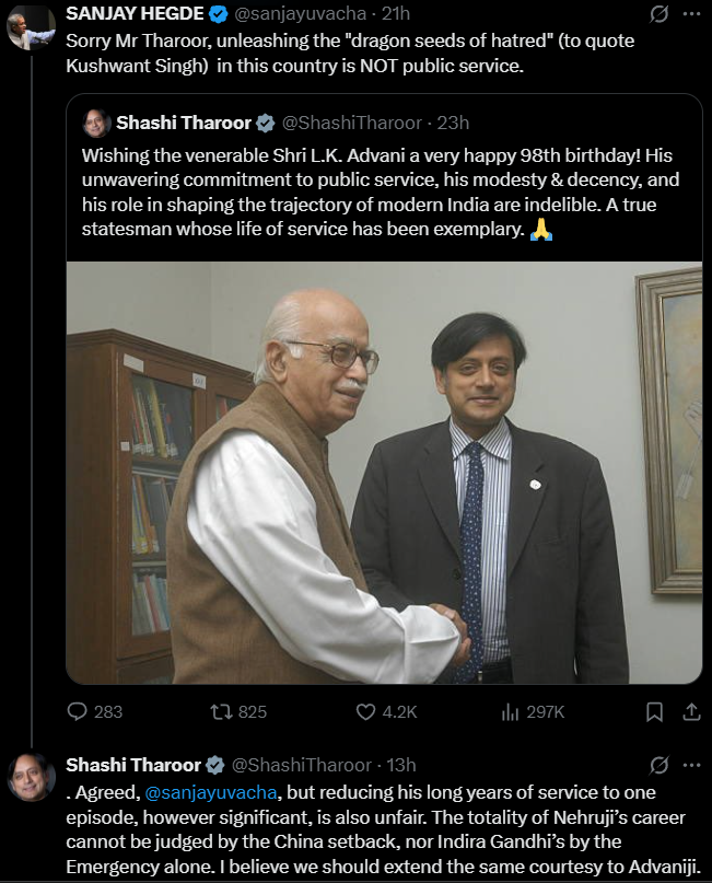 On Sunday, Tharoor fired back in a follow-up post, defending his stance with characteristic eloquence. Replying to a critic who urged a fuller reckoning of Advani’s career, he argued: “Agreed… but reducing his long years of service to one episode, however significant, is also unfair. The totality of Nehruji’s career cannot be judged by the China setback, nor Indira Gandhi’s by the Emergency alone. I believe we should extend the same courtesy to Advaniji.”